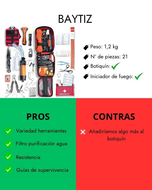 En resumen, el BAYTIZ Kit de Supervivencia destaca por su versatilidad, portabilidad y la calidad de los elementos incluidos, siendo una opción completa y práctica para diversas situaciones de emergencia y actividades al aire libre.